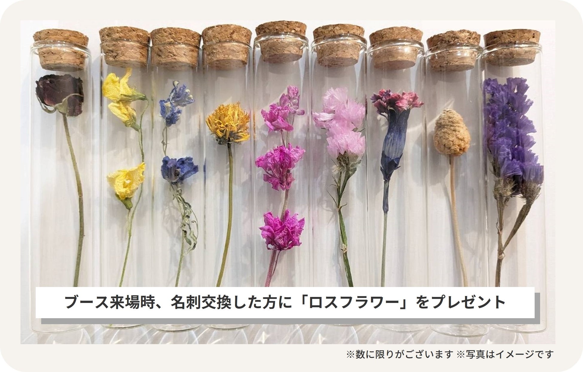 来場時、名刺交換させていただいた⽅には、ブース装飾でも使用されている「ロスフラワー」の一輪挿しをプレゼントいたします。