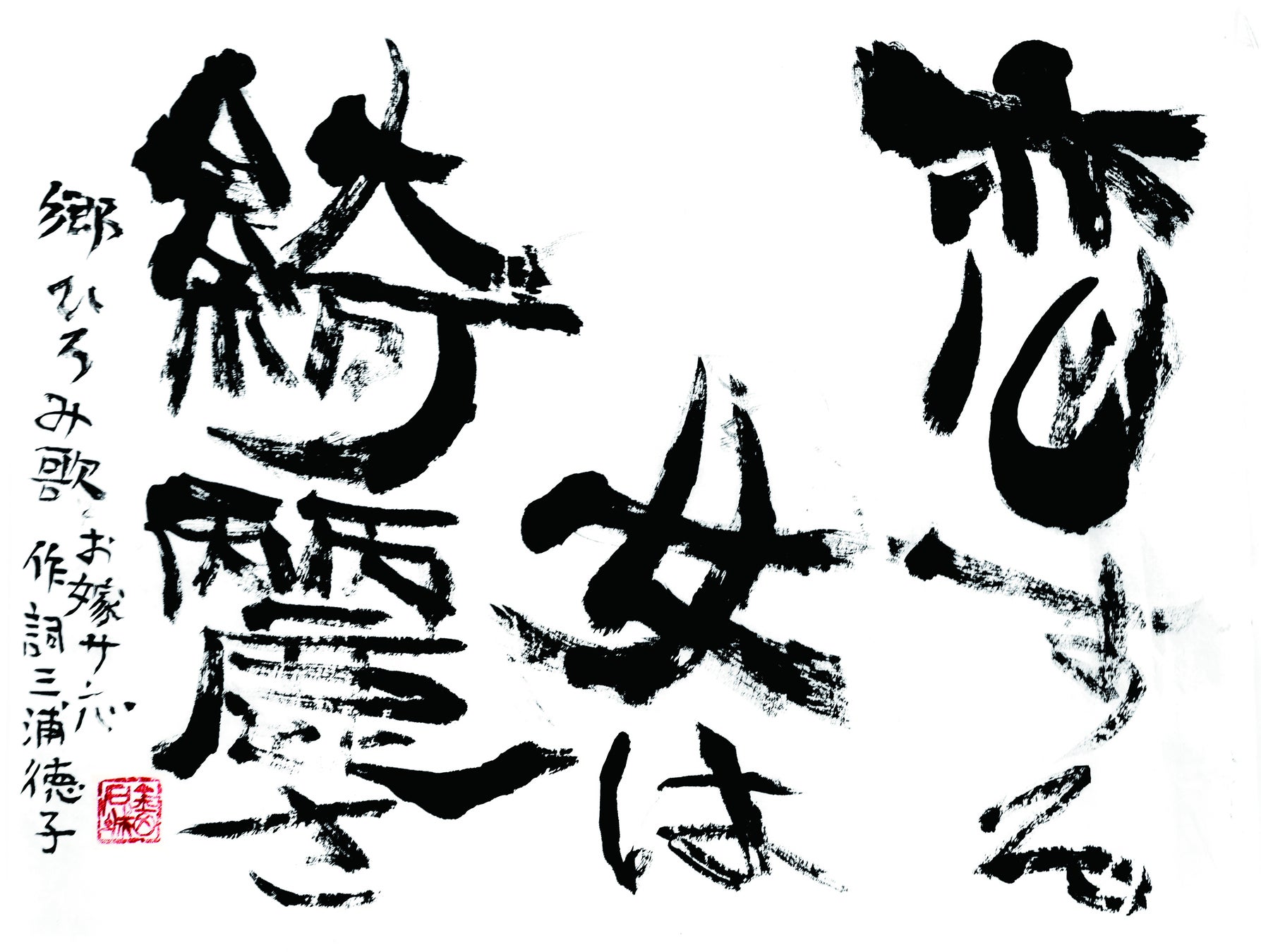 会場には「2億4千万の瞳」、「お嫁サンバ」をはじめとする数多くの名曲から歌詞を抽出した30点以上の作品を展示。美しい言葉のひとつひとつが、金田氏の奥深い墨の濃淡や巧みな筆使いによって一層の迫力を増し存在感を高めています。