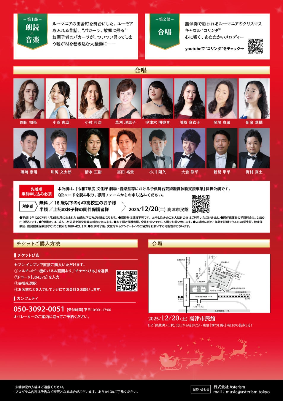 溝の口公演に声優 芹澤 優出演決定!『ルーマニアのクリスマス』 ルーマニアの昔話朗読 声楽歌手の合唱で贈るクリスマスコンサート
