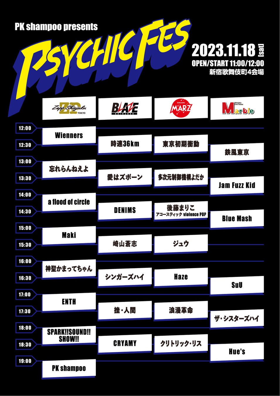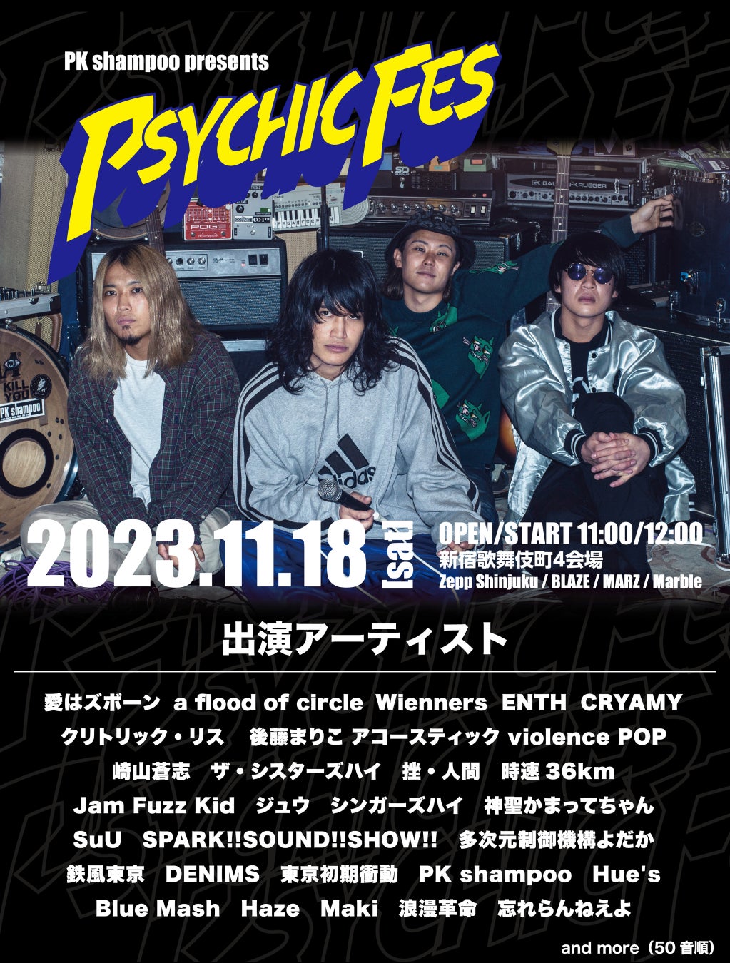 11月18日(土)にPK shampooプロデュース・サーキットフェス「PSYCHIC FES」が初開催される。Zepp Shinjukuを中心として、新宿BLAZE、新宿MARZ、新宿Marbleの新宿歌舞伎町一帯のライブハウス4会場にて行われるが、全会場における出演アーティストのタイムテーブルが本日発表となった。「PSYCHIC FES」は、ライブシーンを盛り上げようとPK shampooと縁の深いアーティストを中心に現在総勢28組のアーティストの出演が発表され大きな話題となっている。チケットは絶賛一般発売中。まだチケットを入手していない方は是非早めに購入してほしい。