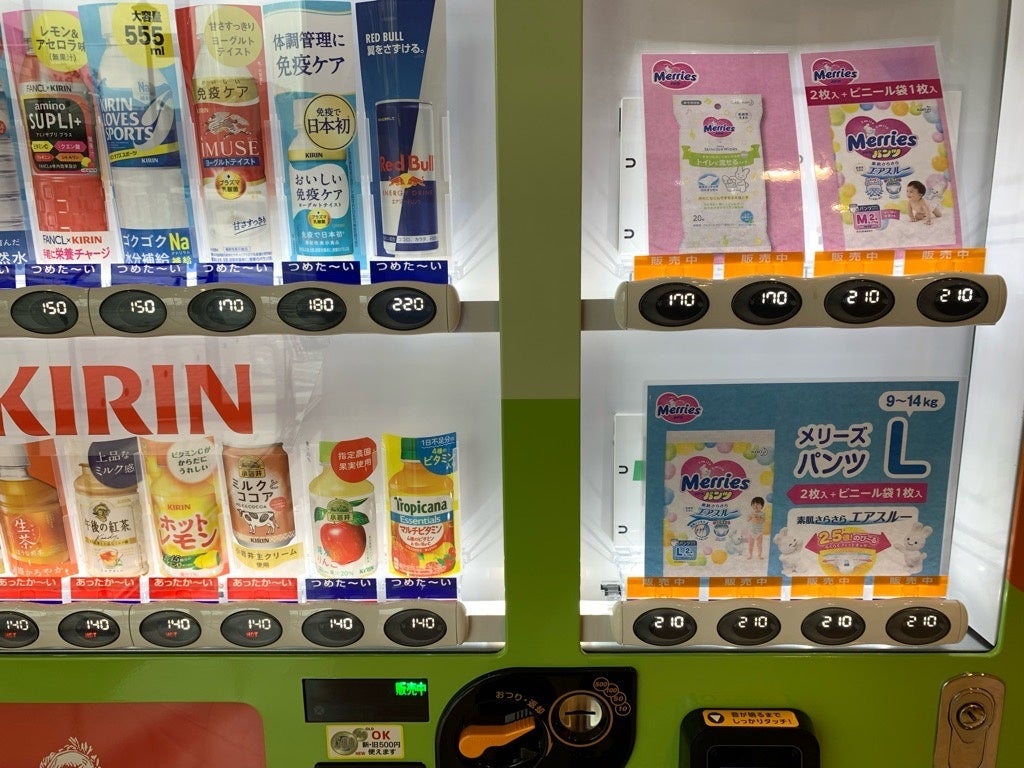 通常の自動販売機と同様に飲料はもちろん、紙おむつや、おしり拭きシートも購入できるので、小さなお子さまとのお出かけの際の、いざという時に役立つ自動販売機です。衛生面にも配慮されており、購入品によって取り出し口がそれぞれ分かれていますので、安心してご利用いただけます。
