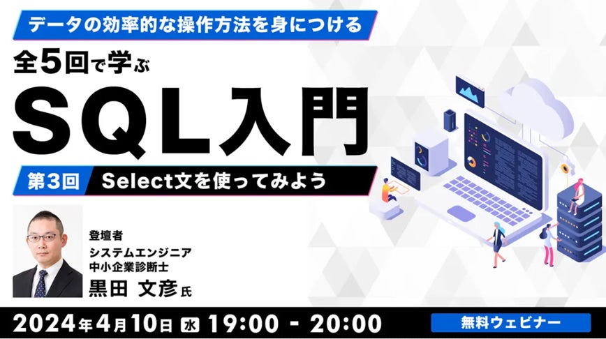 株式会社クリーク・アンド・リバー社(C&R社)は4月10日(水)、Webクリエイターの方でデジタルマーケティング(デジマ)領域へのキャリアチェンジをお考えの方や、Excelを使ったオペレーション業務からデータ分析業務へスキルアップしたい事務職の方などを対象に、無料のオンラインセミナー「データの効率的な操作方法を身につける 全5回で学ぶSQL入門(3)~Select文を使ってみよう~」を開催します。
