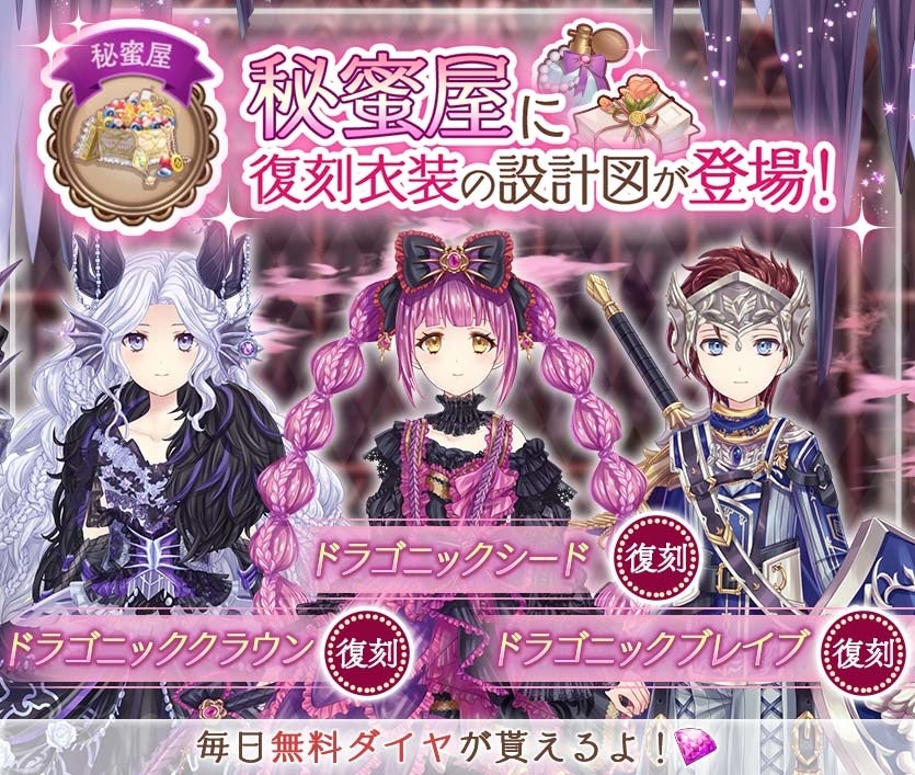 秘蜜屋にて「ドラゴニッククラウン」「ドラゴニックシード」「ドラゴニックブレイブ」コーデの設計図が登場中です! 復刻コーデ設計図のラインナップは2週間ごとに切り替わります♪