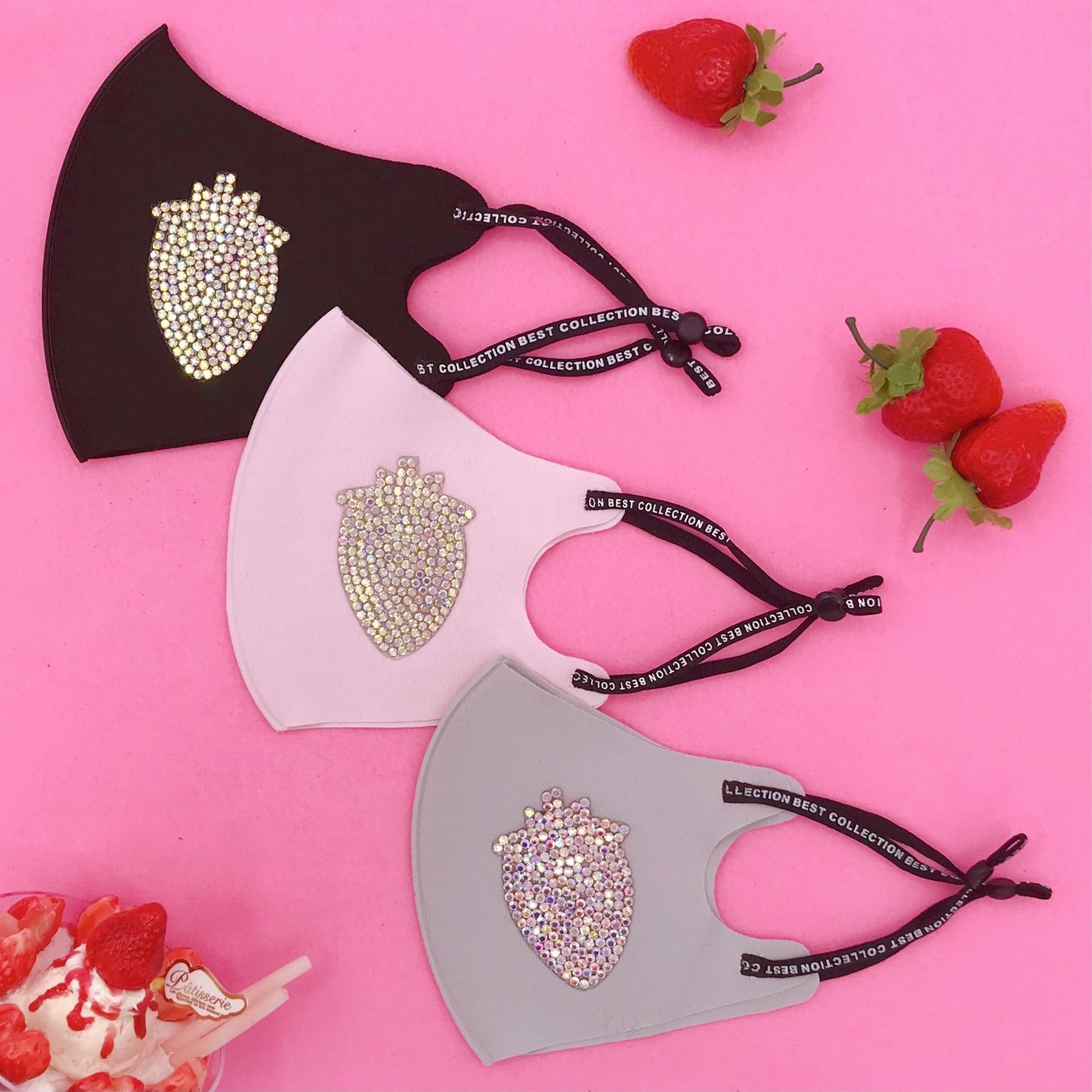 ラインストーンで描かれたイチゴのマスクは柔らかい伸縮性のある素材で、うれしいUVカット機能付き♪ストラップは長さ調整も可能です