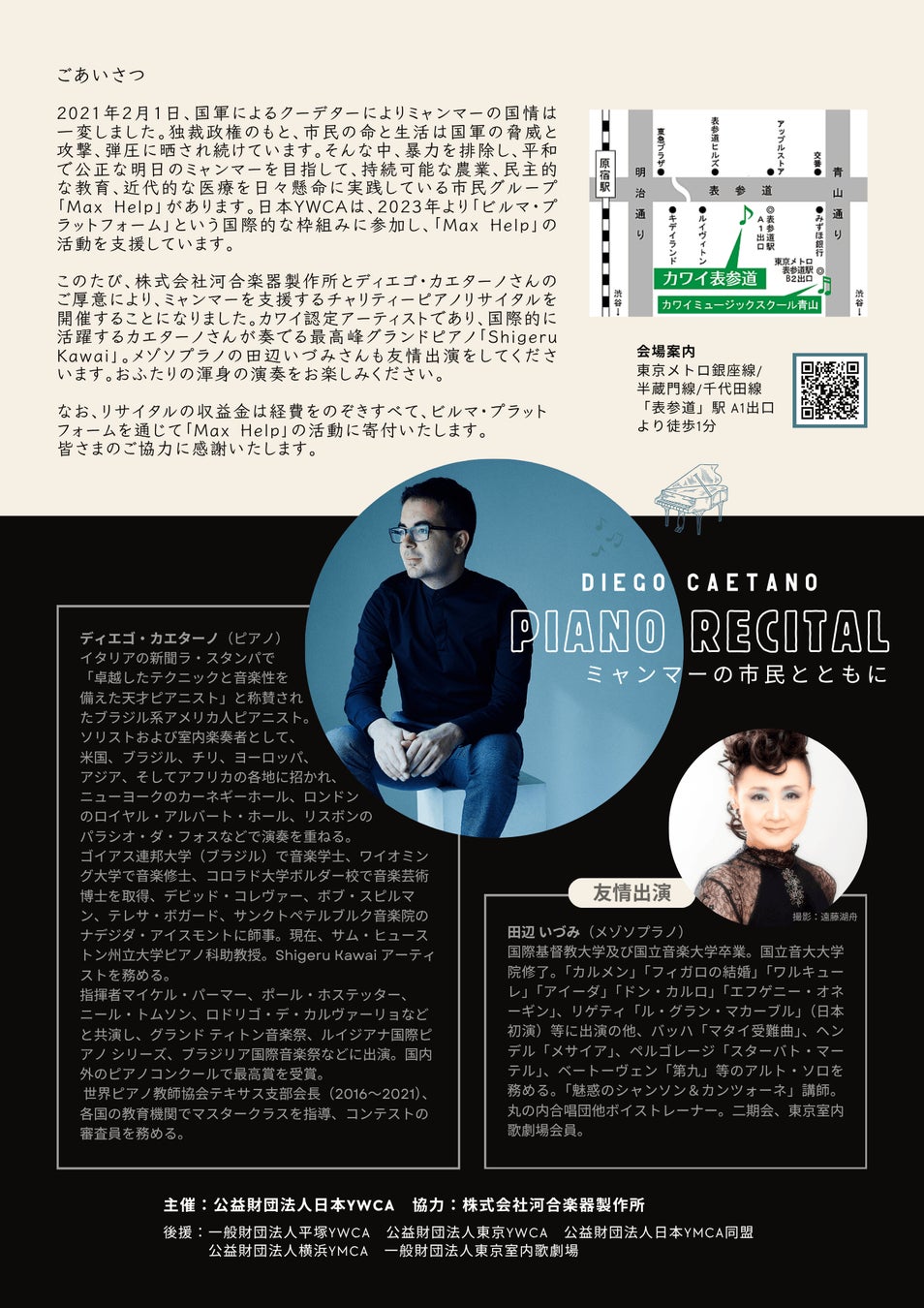 このたび、株式会社河合楽器製作所とディエゴ・カエターノさんのご厚意により、ミャンマーを支援するチャリティーピアノリサイタルを開催いたします。