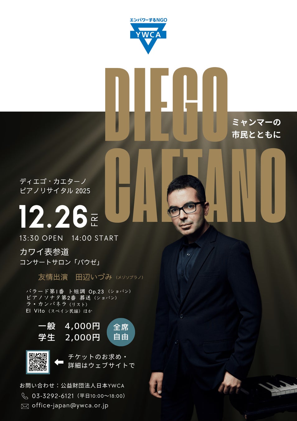 公益財団法人日本YWCA主催、株式会社河合楽器製作所協力『ディエゴ・カエターノ ピアノリサイタル~ミャンマーの市民とともに~』が2025年12月26日(金)にカワイ表参道 コンサートサロン「パウゼ」(東京都渋谷区神宮前5-1)にて開催されます。
