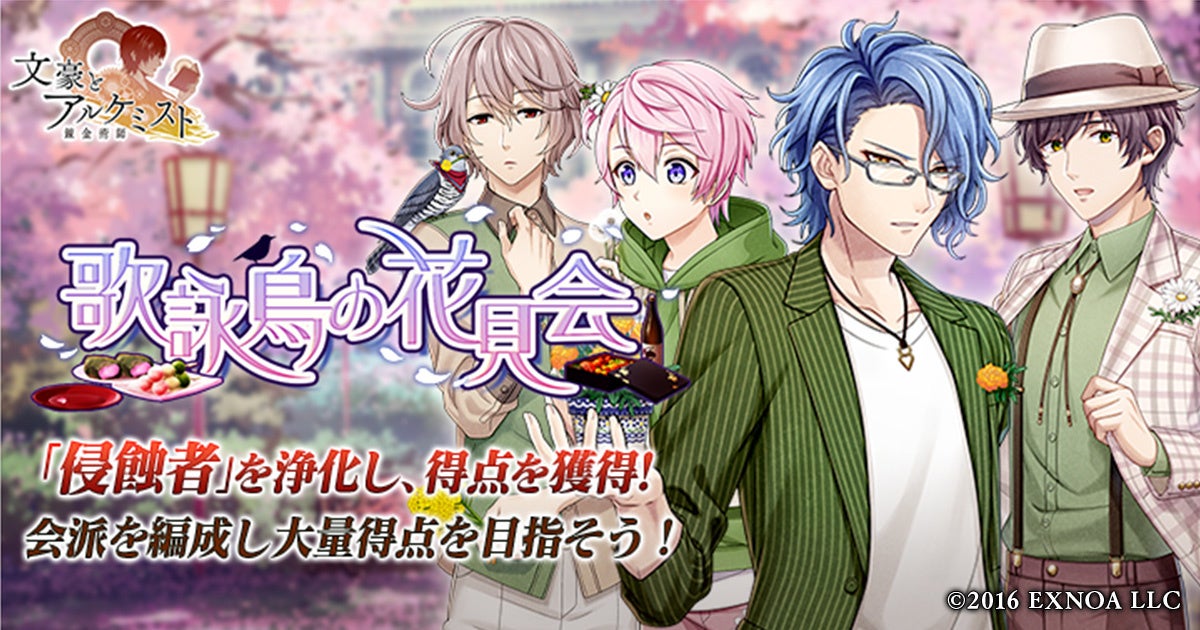 合同会社EXNOA(本社:東京都港区、CEO:村中 悠介、URL:https://games.dmm.com/)が運営するDMM GAMESは、4月21日(木)より、女性向け文豪転生シミュレーションゲーム「文豪とアルケミスト」において、イベント『調査任務「歌詠鳥の花見会」』と限定召装「歌詠鳥の花見会」を開催いたしました。
