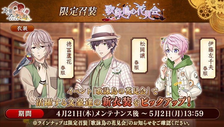 文豪の「衣装」や、会派に装備する事で能力を強化できる「装像」などが入手できるコンテンツ「召装」に、限定召装『歌詠鳥の花見会』が期間限定で登場します。この召装では、イベント『調査任務「歌詠鳥の花見会」』で活躍する「徳冨蘆花」「松岡譲」「伊藤左千夫」の新衣装を一定の確率で入手できます。