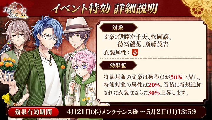 さらに、イベントと同時に開催される限定召装『歌詠鳥の花見会』にて新規追加された「伊藤左千夫」「松岡譲」「徳冨蘆花」の〈春服〉を編成すると、得点の獲得率がそれぞれ30%上昇します。