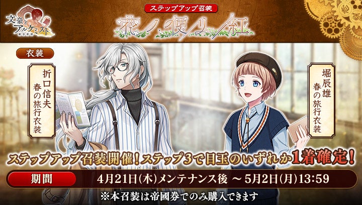 文豪の「衣装」や、会派に装備する事で能力を強化できる「装像」などが入手できるコンテンツ「召装」に、限定召装「花ノ便リ・紅」が期間限定で登場します。この召装では新しく追加された折口信夫と堀辰雄の〈春の旅行衣装〉を獲得できます。