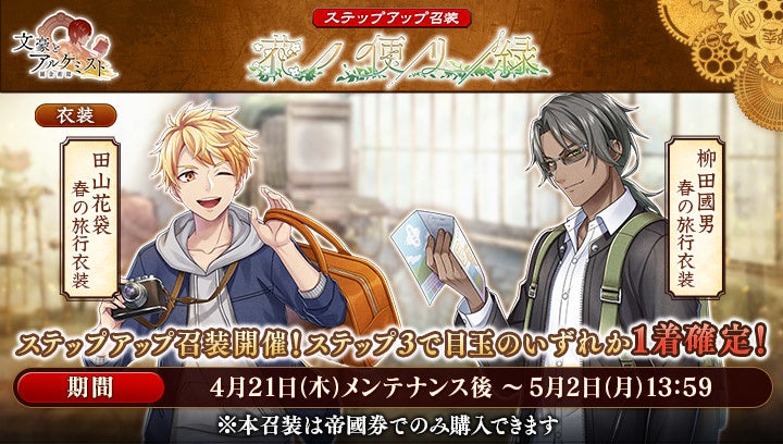 文豪の「衣装」や、会派に装備する事で能力を強化できる「装像」などが入手できるコンテンツ「召装」に、限定召装「花ノ便リ・緑」が期間限定で登場します。この召装では新しく追加された田山花袋と柳田國男の〈春の旅行衣装〉を獲得できます。