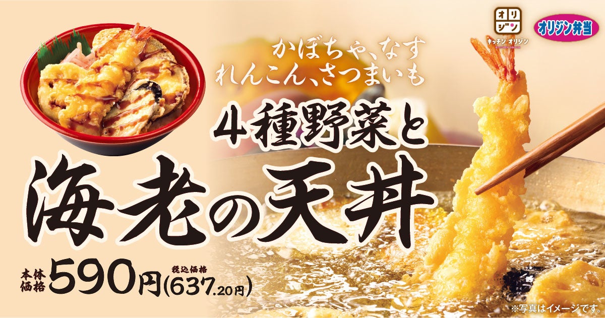 弁当・惣菜専門店「オリジン弁当」「キッチンオリジン」を展開しているイオングループのオリジン東秀株式会社(本社:東京都調布市/代表:沢村 弘也)は、8月16日(火)10時より、「4種野菜と海老の天丼」を期間限定で販売いたします。