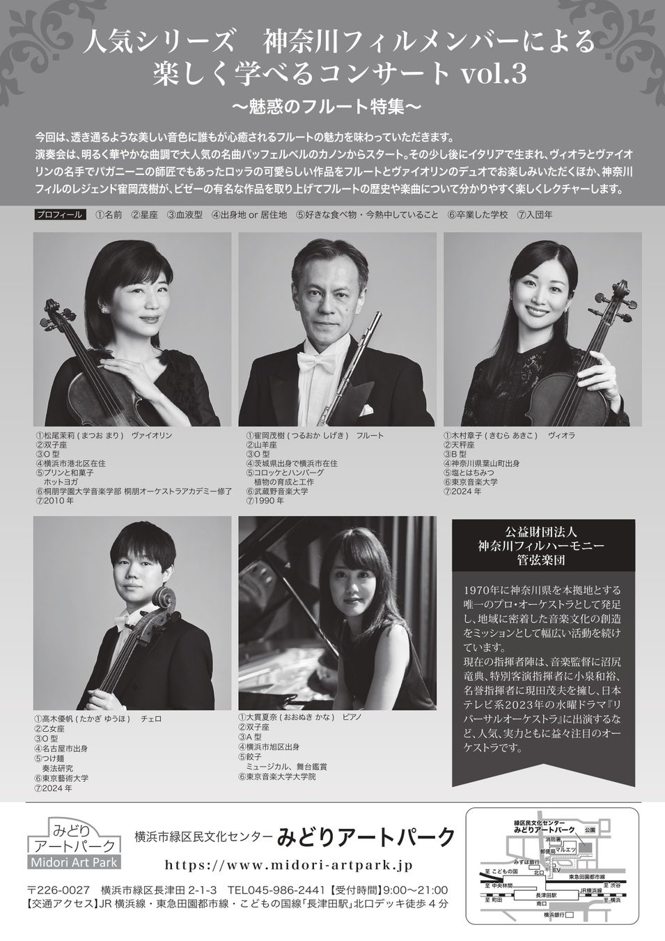横浜市緑区民文化センター みどりアートパーク主催、『神奈川フィルメンバーによる楽しく学べるコンサートvol.3』~魅惑のフルート特集~が2026年5月31日 (日)に横浜市緑区民文化センター みどりアートパーク(神奈川県横浜市緑区長津田2丁目1番3号)にて開催されます。