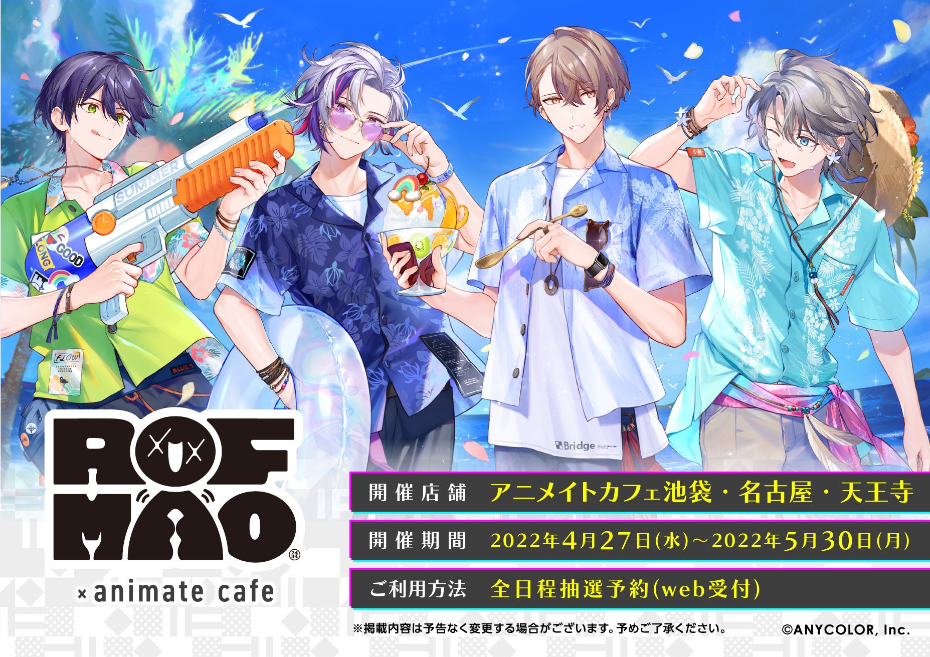 人気アニメ・ゲーム作品とのコラボレーションを展開する株式会社アニメイトカフェは、ANYCOLOR株式会社が運営するVTuber / バーチャルライバーグループ「にじさんじ」の所属ライバー「加賀美ハヤト」「剣持刀也」「不破湊」「甲斐田晴」によるユニット「ROF-MAO」(読み:ろふまお)のコラボレーションカフェを、2022年4月27日よりアニメイトカフェ池袋・名古屋・天王寺で開催いたします。コラボレーションカフェでは、メンバー4人をイメージしたコラボメニューのほか、アニメイトカフェ限定イラストを使用した限定グッズを販売いたします。