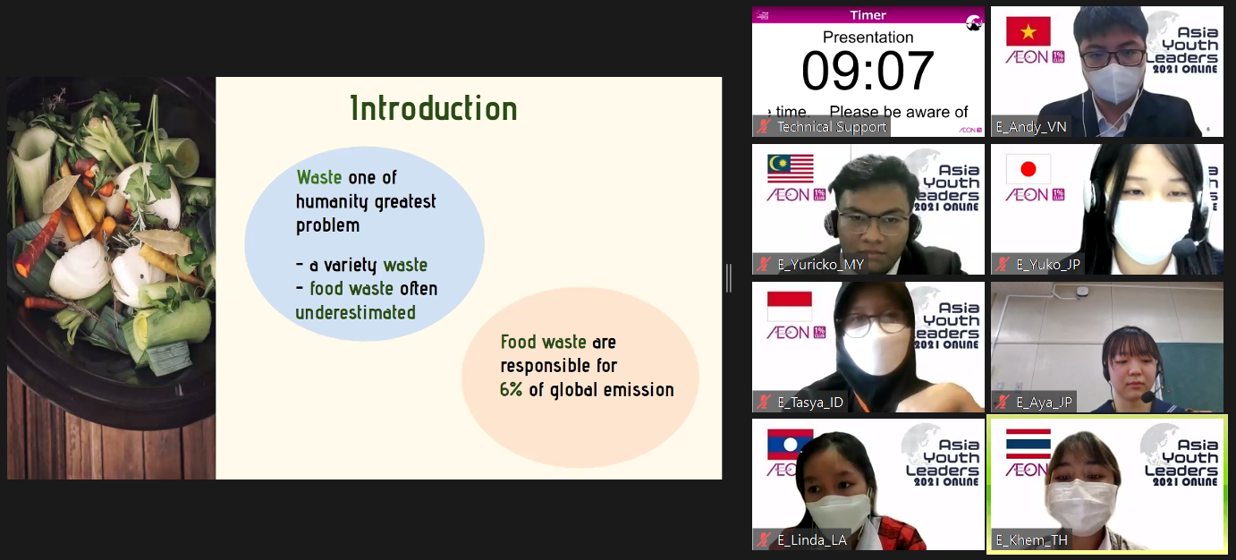 インドネシア、カンボジア、タイ、中国、日本、ベトナム、マレーシア、ラオスの8カ国70名の高校生が、気候変動や世界の食料問題に関する有識者の講演を視聴した後、異なる国のメンバーで構成された10チームに分かれてグループディスカッションを行い、最終日には、CO2削減のため、どのような食べ物を選んで食べるべきかについてグループごとにまとめた提案を発表し、その成果を競います。