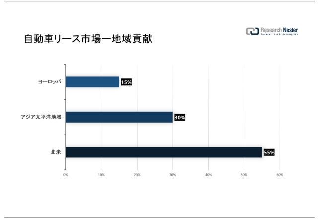 北米の自動車リース市場は、他のすべての地域の市場の中で、2033 年末までに最大の市場シェアを保持すると予測されています。この地域には強力な自動車ネットワークが存在し、個人や企業の間で自動車をリースする傾向が高まっていることに伴い、自動車の数が増加しています。たとえば、推定によると、2019 年の米国の新車所有者の約 30% が、車のリースを選択しています。高級車の世界の自動車レンタの半分以上は米国にあります。さらに、ニューヨークとミシガン州では、18 歳未満の車両を借りる許可証の所有者がいます。これらすべての要因により、この地域の市場の成長がさらに促進されます。2022 年には、17,000 を超える自動車レンタ会社が米国で営業していました。