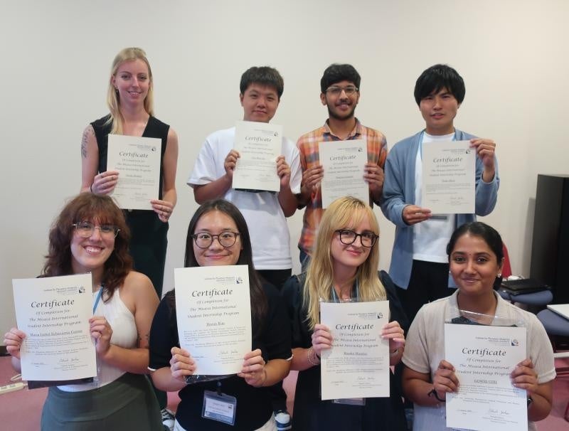 修了式・送別会では、芳野極惑星物質研究所長より修了証書と惑星物質研究所記念グッズが贈呈され、インターンシップ学生らは、指導教員や大学院生との最後の交流を楽しみました。Veerle Donkerさん(修士1年・Vrije University of Amsterdam)はMISIPを振り返り、「このような素晴らしい機会を与えてくださった岡山大学と惑星物質研究所に感謝しています。指導教員の先生方と共に世界でも著名な研究所での研究活動はとても素晴らしい経験でした。また、研究活動だけでなく、日本の文化や自然に触れ、生涯の友と呼ぶことのできる友人ができました」と感謝の言葉を述べました。