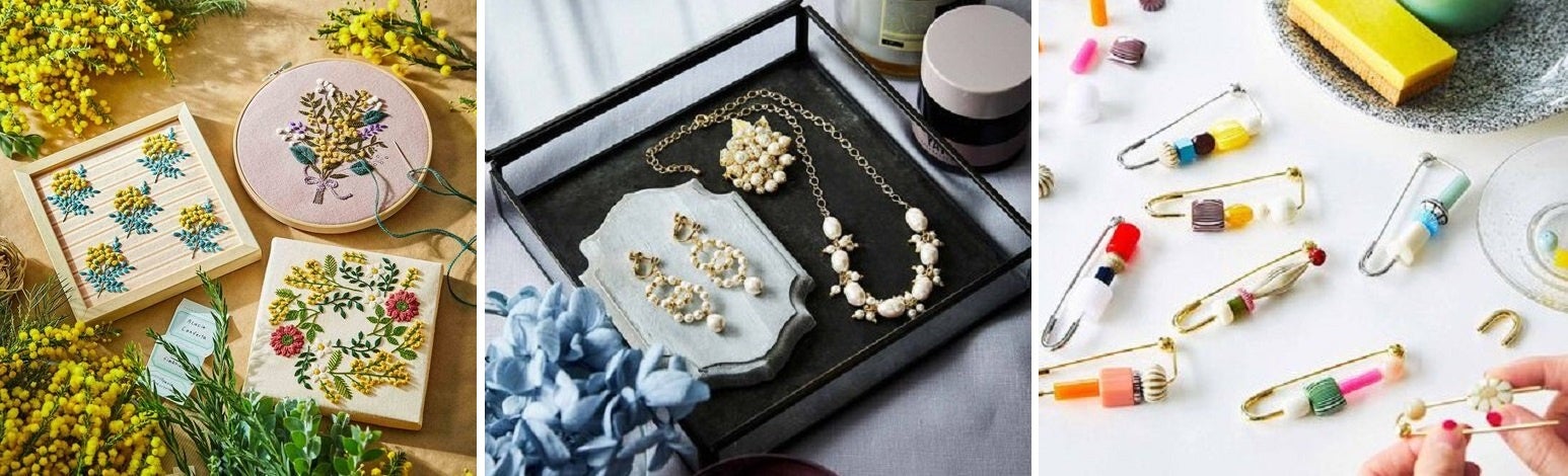 刺しゅうやパール風ビーズのアクセサリーから手軽で短時間でできるものまでさまざまなキットがあります。