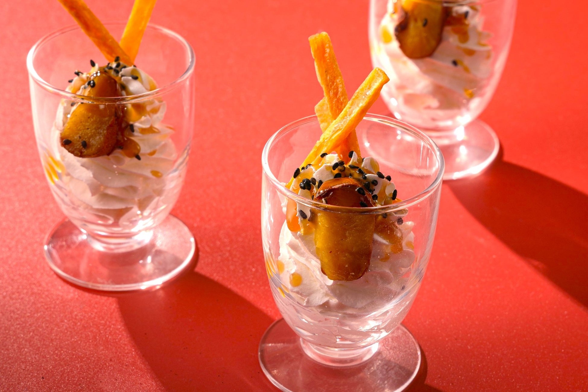 絹のようななめらかでふんわりとした食感とリッチな味わいが愉しめる新メニューの「生搾りアイスモンブランのパンケーキ仕立て」は絶対味わっていただきたい一皿。目の前で出来立てをご提供します。さらに、ねっとりした上品な甘さとソフトクリームが絶妙な「金蜜芋のミニパフェ」も新たに登場。お口直しにもおすすめです。