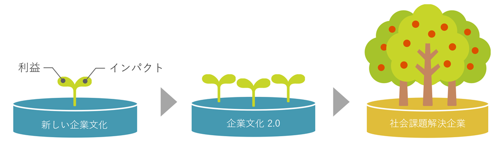 丸井グループは、人的資本投資を通じて「社会課題解決企業への進化」をめざしています。2019年に策定したVISION2050にて「インパクトと利益の二項対立を乗り越える」というビジョンを掲げ、企業文化の変革によってこのビジョンの実現に向けたイノベーションが創出できるようになってまいりました。VISION2050という種から生まれたイノベーションはまだ小さな「芽」にすぎませんが、インパクトと利益という「双葉」をつけたこれらの芽は、私たちが今後拡大していくビジネスの原型を示しています。こうした「芽」を増やし、成長させることで大きな樹に育て上げ、たくさんの果実を実らせることで、社会課題解決企業へと進化してまいります。