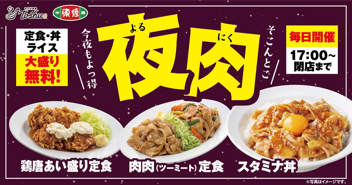 中華料理店「れんげ食堂Toshu」「中華東秀」を展開しているイオングループのオリジン東秀株式会社(本社:東京都調布市/代表:沢村 弘也)は、8月25日(木)より、17時から限定メニュー「夜肉」をリニューアルいたします。