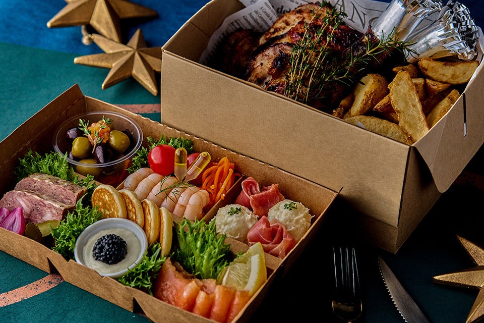 また、ホテルの味をおうちでも楽しんでいただけるよう毎年ご好評のテイクアウト商品もご用意いたします。富士高原どりのジューシーな味わいが楽しめるローストチキンをはじめ、彩り豊かな6種類の品々が並ぶオードブルボックスがおうちで楽しむフェスティブシーズンの食卓を華やかに飾ることでしょう。