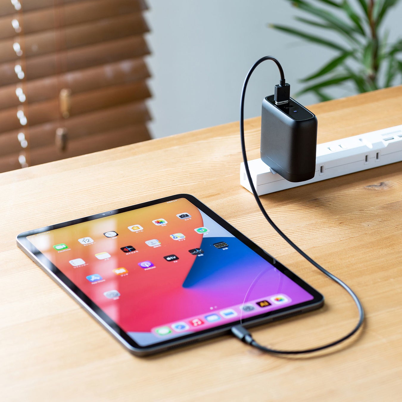 ノートパソコンなどの大型デバイスへの充電に対応したUSB Type-Cポートと、スマートフォンなどの小型デバイスへの充電に最適なUSB Aポートの2種類の出力ポートを搭載し、ノートパソコンの充電と同時にスマートフォンなどのUSB充電機器への充電もできます。