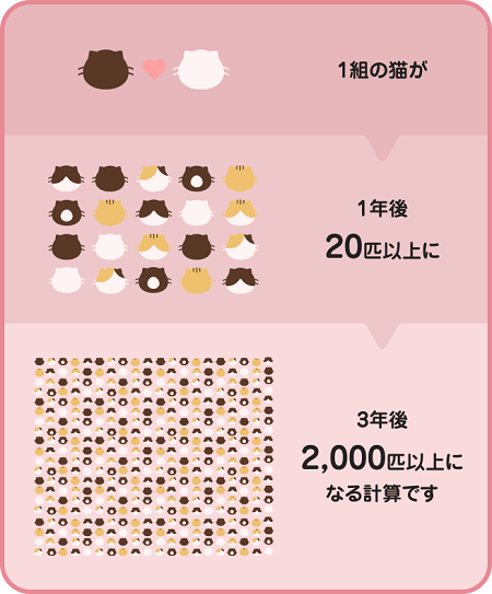 現在(※)日本では、年間2,434頭の犬と、9,472匹の猫がさつ処分されています。その大半は、捨てられた猫などが外で繁殖してしまい生まれた野良猫の子猫です。猫の繁殖能力は強く、年に2~3回、1回に4~8匹も出産をし、理論的には1組の猫のカップルから、3年後には2,000匹以上にもなるという試算もあります。不幸なさつ処分を減らすためには、野良猫に不妊去勢手術を施し、悲しい運命をたどる命を増やさないことが、最も大切です。