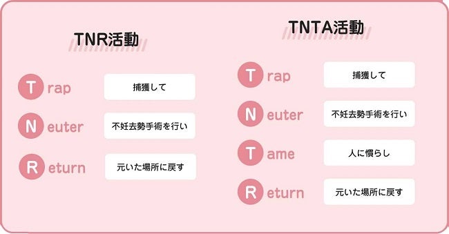 野良猫を捕獲して、不妊去勢手術をすることを、Trap(捕獲して)、Neuter(不妊去勢手術を行い)、Return(元いた場所に戻す)の頭文字をとって、「TNR活動」と呼びます。さらに、去勢後は「人に慣らして、譲渡する」というところまでを支援する「TNTA」という活動も近年広がっており、こちらの活動も猫部は支援しています。
