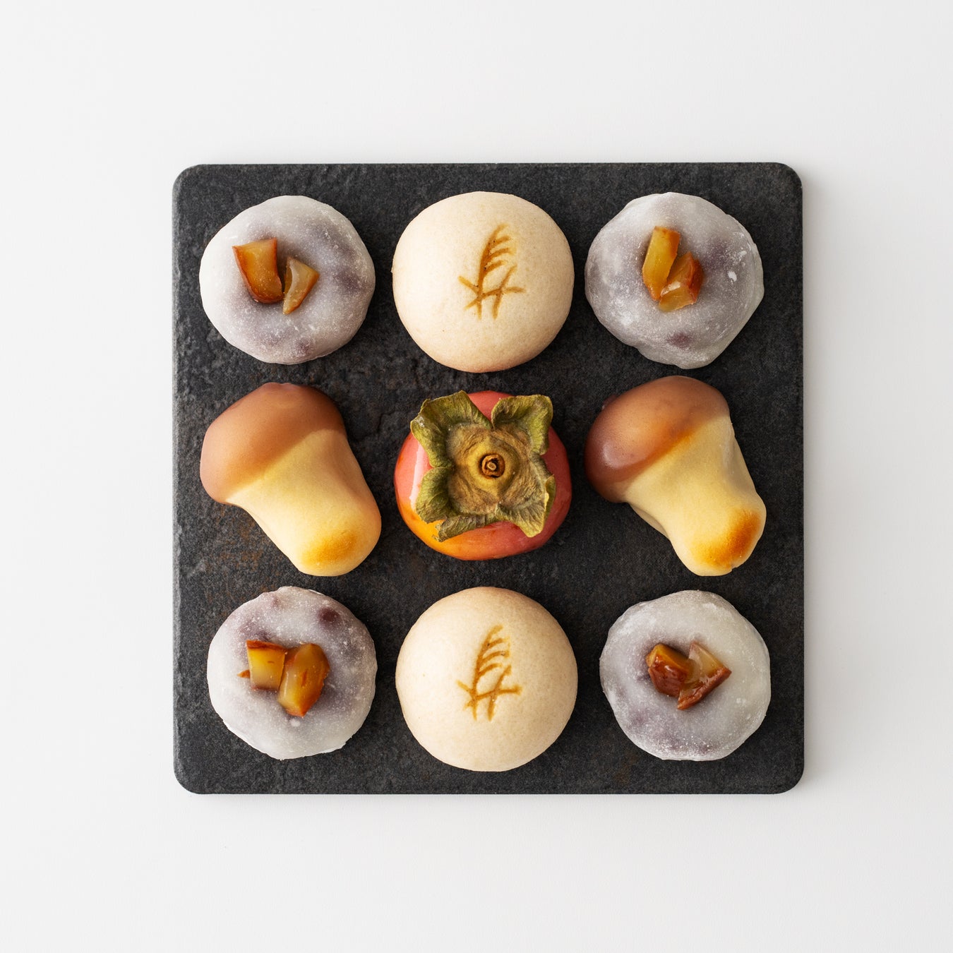 干柿入りの練切(照柿)、玄米薯蕷、桃山(松茸)、栗大福、”秋の実り”のお詰め合わせ。