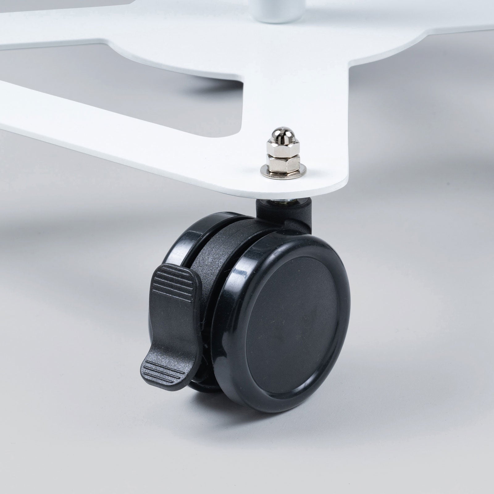 スタンドには直径約75mmの大型キャスターが付属しており、機器を取り付けたままスタンドを移動させることができます。全輪ストッパー付きでしっかりロックできるので、不意に動くことも防ぎます。