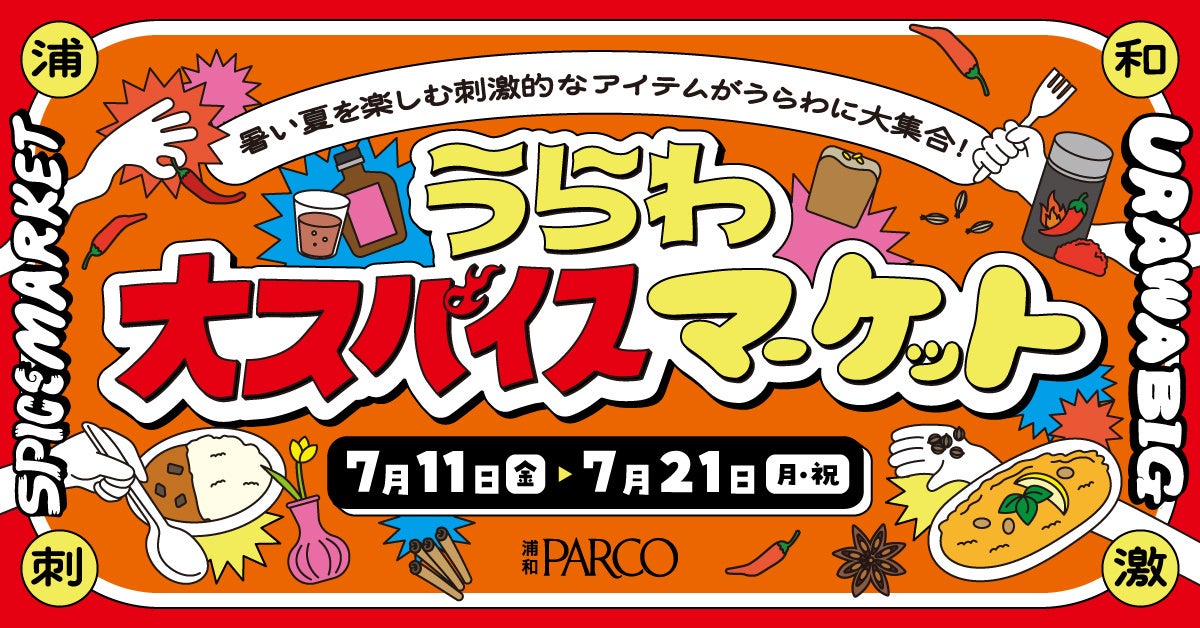 浦和PARCOは、7月11日(金)~7月21日(月・祝)の期間中、「うらわ大スパイスマーケット」を開催いたします。本イベントは「暑い夏を刺激的に楽しもう!」をテーマに、スパイス系のフード・ドリンクや、 刺激的でPOPなアイテムを集めた集合マーケットイベントです。浦和PARCOで毎回ご好評をいただいている「八幡屋礒五郎」POPUP SHOPでは通常、常設店舗のみで行っている七味調合〈カスタムブレンド〉を浦和PARCOで初開催いたします。自分好みのスパイスブレンドをお楽しみいただけます。その他にもレトルトカレーやティーシロップ、世界のヴィンテージアイテムなど個性豊かなアイテムも多数登場。五感を刺激するユニークなラインナップが暑い季節ならではの高揚感や食欲を後押しします。また、館内の5F・6Fレストランでもスパイシーなメニューをご用意。食べて・香って・見て楽しむ“刺激的な夏体験”を提案いたします。今年の夏はぜひ浦和PARCOで、特別なひとときをお過ごしください!