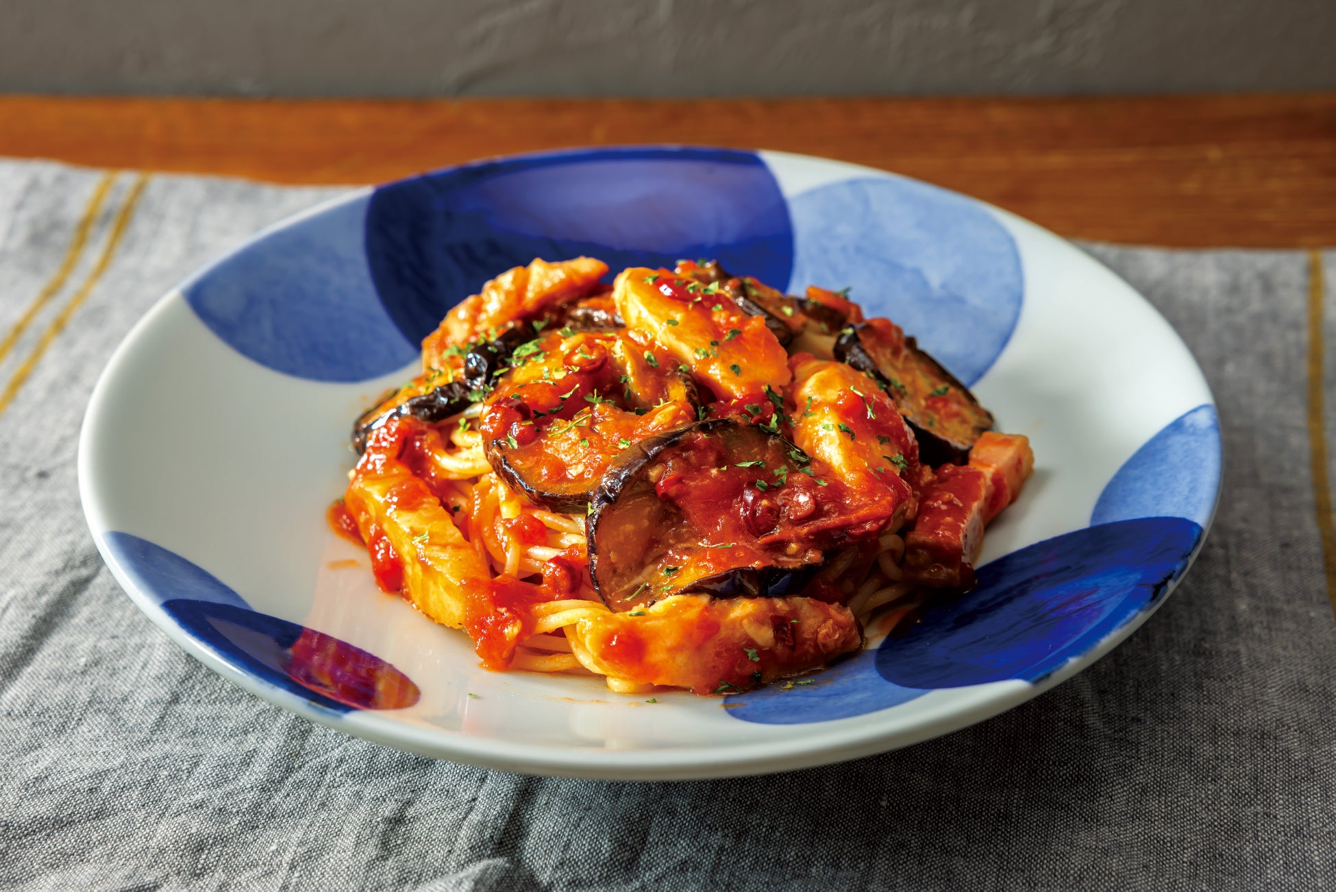 蒸し鶏とグリルベーコン トロトロなすのアラビアータ