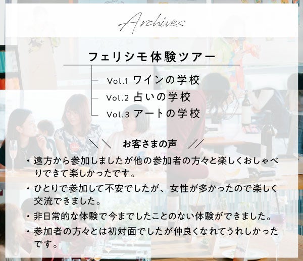 神戸・三宮ウォーターフロントにある「Stage Felissimo」(フェリシモ本社)で、お客さまとともに「とびきりのフェリシモ体験をすることができる」舞台としてフェリシモ体験ツアーが2023年よりスタートしました。ワインの学校からはじまり、占いの学校、アートの学校と開催しています。