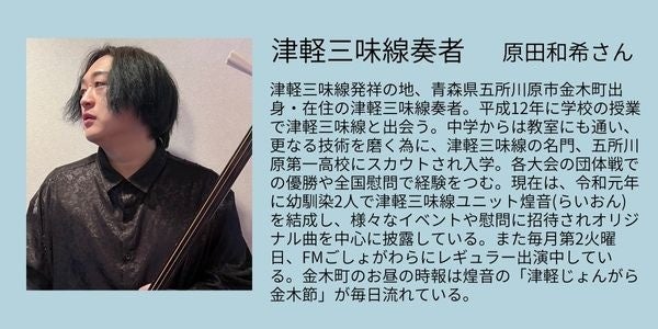 津軽三味線発祥の地、青森県五所川原市金木町出身・在住の津軽三味線奏者。平成12年に学校の授業で津軽三味線と出会う。中学からは教室にも通い、更なる技術を磨く為に、津軽三味線の名門、五所川原第一高校にスカウトされ入学。各大会の団体戦での優勝や全国慰問で経験をつむ。現在は、令和元年に幼馴染2人で津軽三味線ユニット煌音(らいおん)を結成し、様々なイベントや慰問に招待されオリジナル曲を中心に披露している。また毎月第2火曜日、FMごしょがわらにレギュラー出演中している。金木町のお昼の時報は煌音の「津軽じょんがら金木節」が毎日流れている。