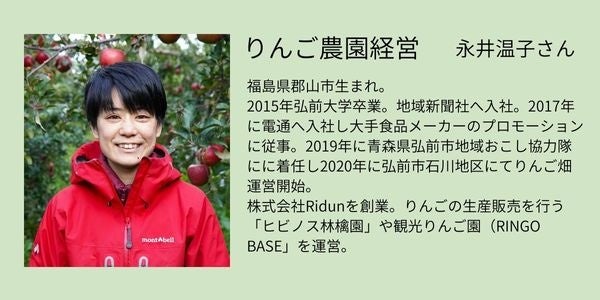 福島県郡山市生まれ。2015年弘前大学卒業。地域新聞社へ入社。2017年に電通へ入社し大手食品メーカーのプロモーションに従事。2019年に青森県弘前市地域おこし協力隊に着任し2020年に弘前市石川地区にてりんご畑運営開始。株式会社Ridunを創業。りんごの生産販売を行う「ヒビノス林檎園」や観光りんご園(RINGOBASE」を運営。