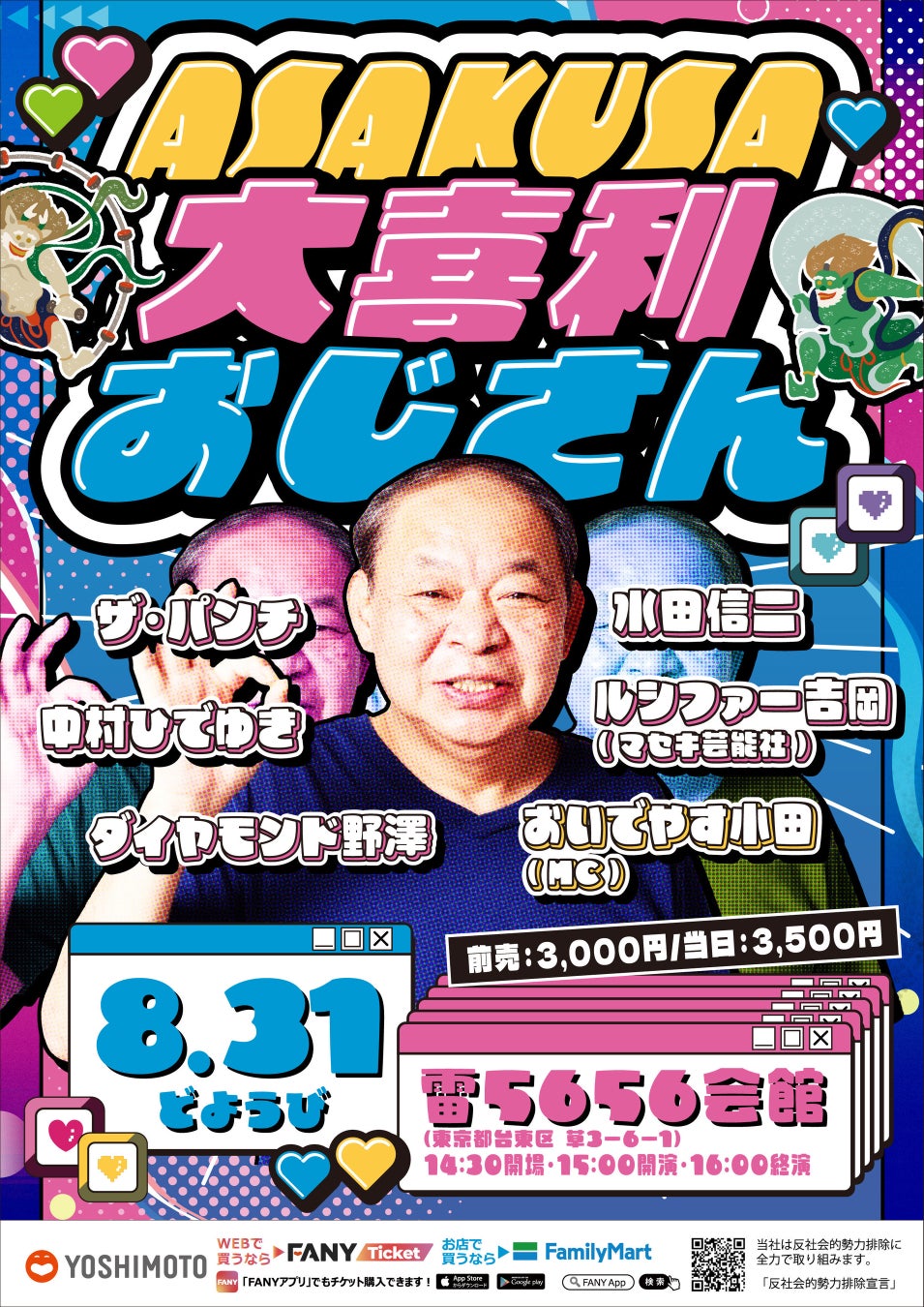 今勢いのあるシンクロニシティ・エバース・カゲヤマ・オダウエダ芸歴30周年を迎えたベテラン、次長課長・チュートリアル・シャンプーハットなど豪華メンバーが浅草に大集結!