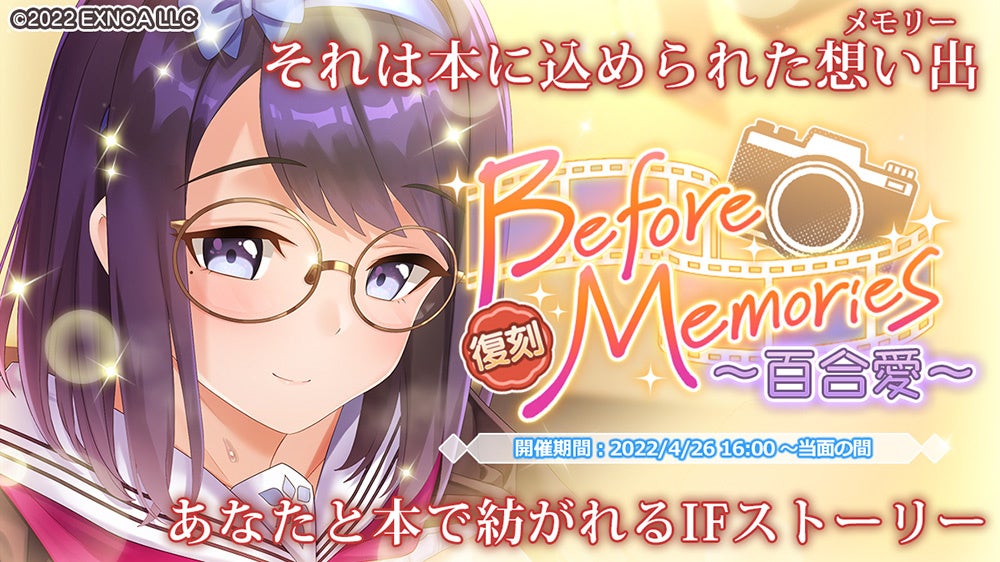 合同会社EXNOA(本社:東京都港区、CEO:村中 悠介、https://games.dmm.com/)が運営するDMM GAMESにおいて、現在好評配信中のリアルチャットで物語が進展する新感覚恋愛ゲーム『プラスリンクス ~キミと繋がる想い~』は、本日より、学園生時代のヒロインとのもしもの恋愛を体験できる「Before Memories」シリーズから百合愛編を復刻開催いたします。また、ヒロインたちの春の装いをお楽しみいただける春服コーデシリーズに新たに百合愛、北斗、るるを追加いたしますのでお知らせします。