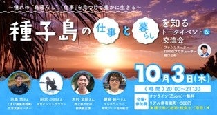 10月3日(木)20:00~は、「TURNS」の協力で『種子島の仕事と暮らしを知る トークイベント&交流会』(リアル開催/定員20名/参加費500円/オンライン参加は定員制限なし、無料)を実施。実際に移住し働いている方が登壇し、仕事の内容や、想定される島での暮らし、実際にこれまでどんな風に暮らしてきたかの経験談を語り、11月に実施する現地ツアーの説明会も行います。会場参加者にはトークイベント終了後に交流会も実施します。