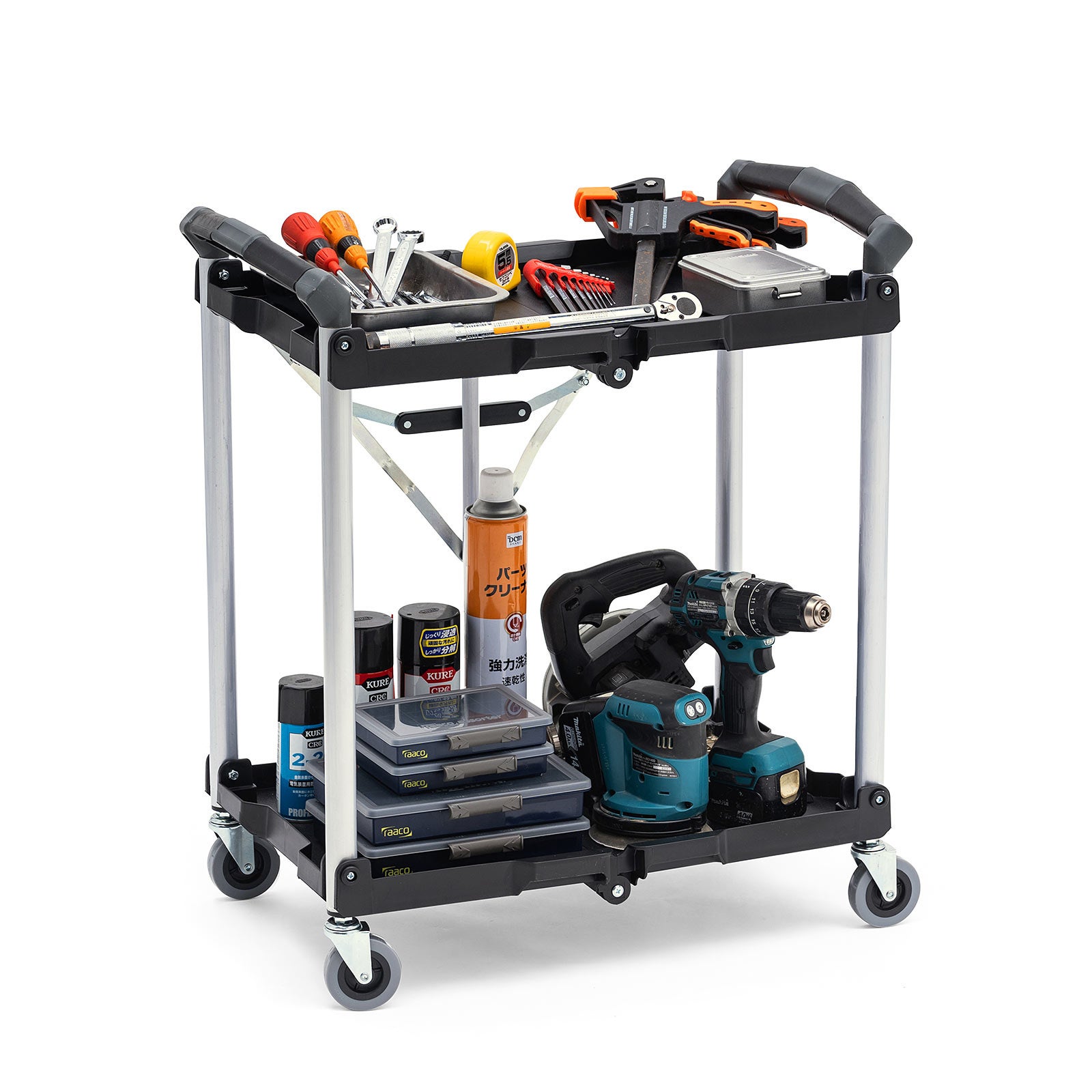 本製品は、工具やツールを収納・整理・整頓出来るツールワゴンです。2段式で多くの道具を分けて収納することができます。