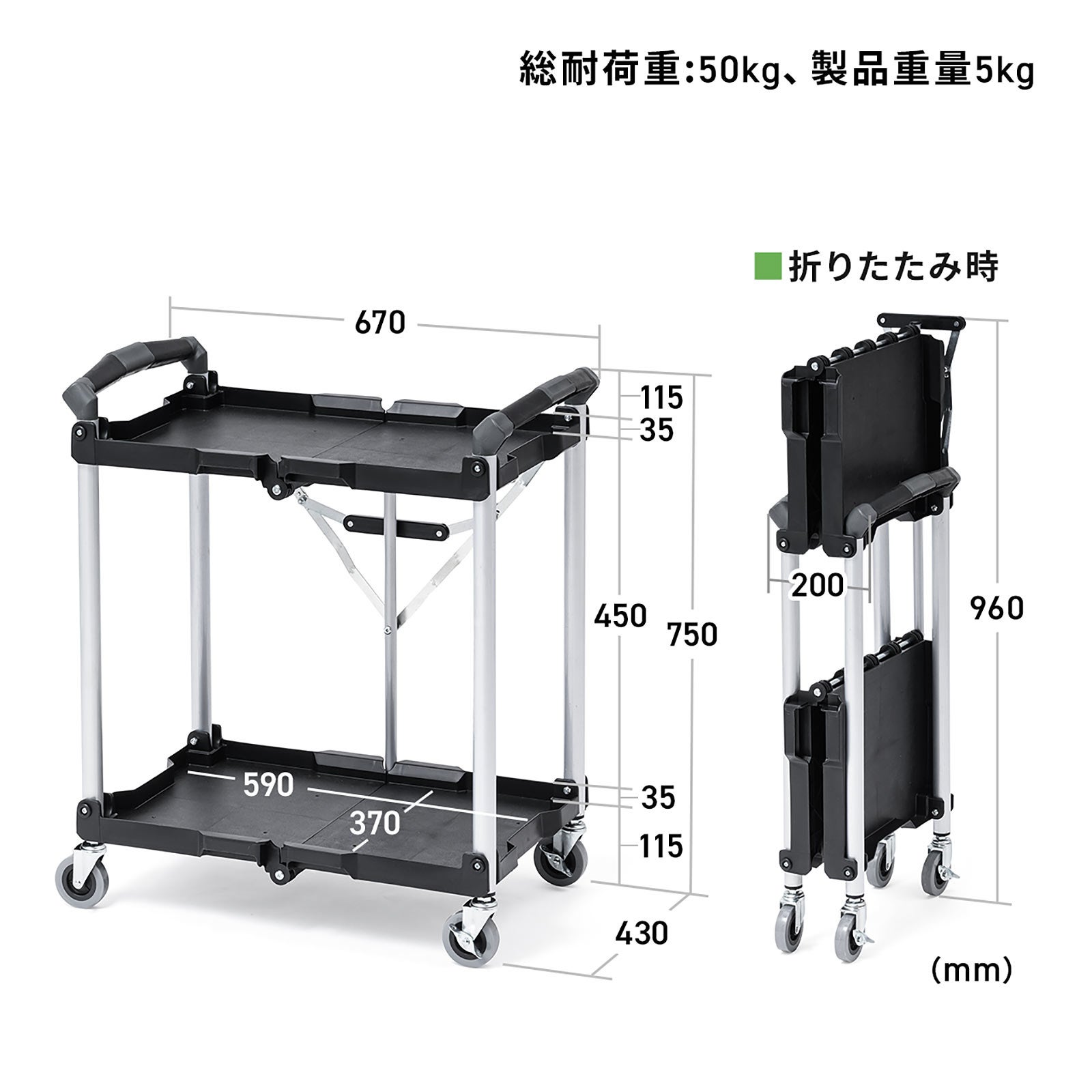 ツールワゴン ファイルワゴン キャスター付 2段 折りたたみ 総耐荷重50kg 4輪 軽量
