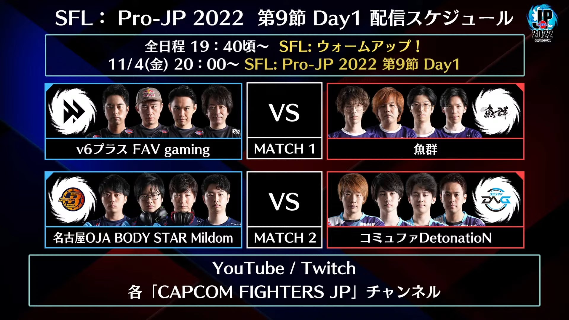 「ストリートファイターリーグ: Pro-JP 2022」第9節Day1は、11月4日(金)20時から「CAPCOM Fighters JP」の公式YouTube、Twitchチャンネルにて配信します。