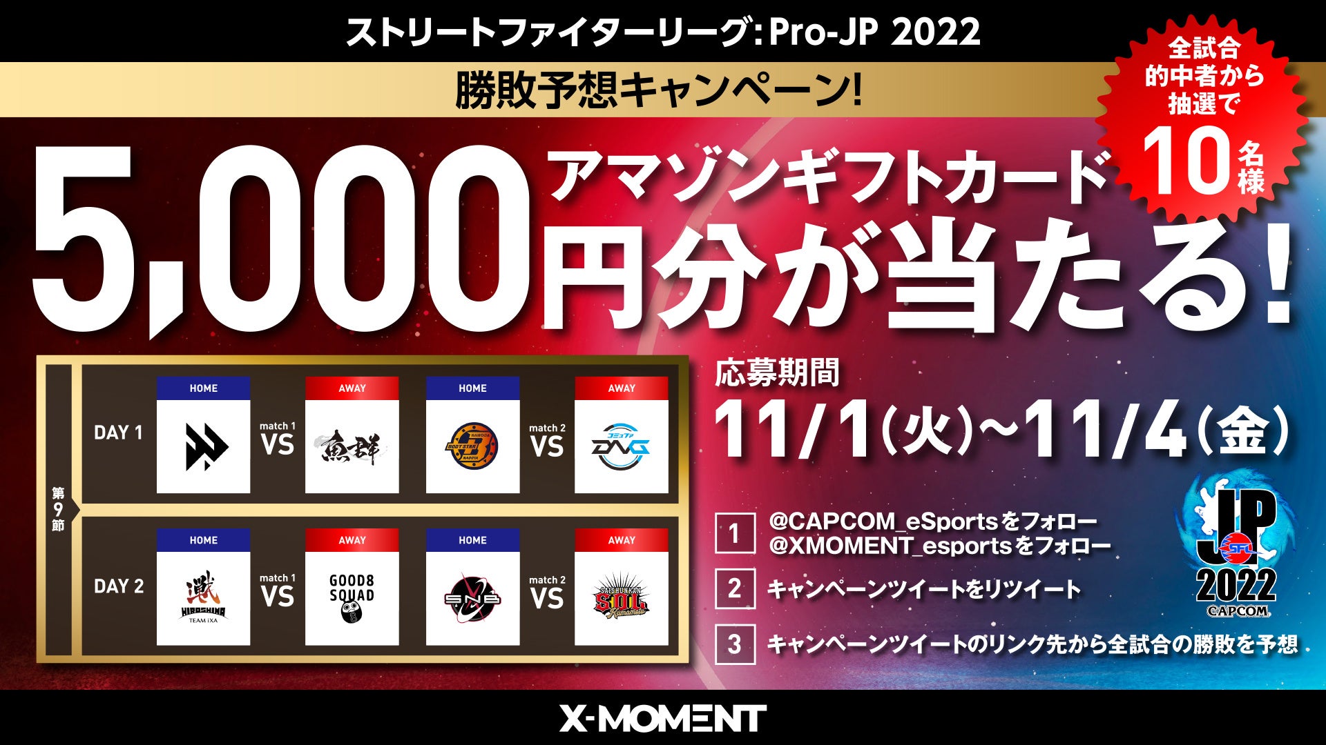 「ストリートファイターリーグ: Pro-JP 2022」第9節で行われる全4試合の勝敗結果を予想して、キャンペーン入力フォームで各試合の勝利チームを選択してください。