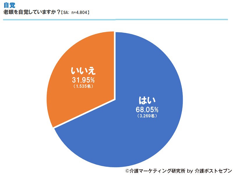 「老眼を自覚していますか」と質問したところ、「はい」と回答した人が68.05%、「いいえ」と回答した人が31.95%でした。約3人に2人が老眼を自覚していることになります。