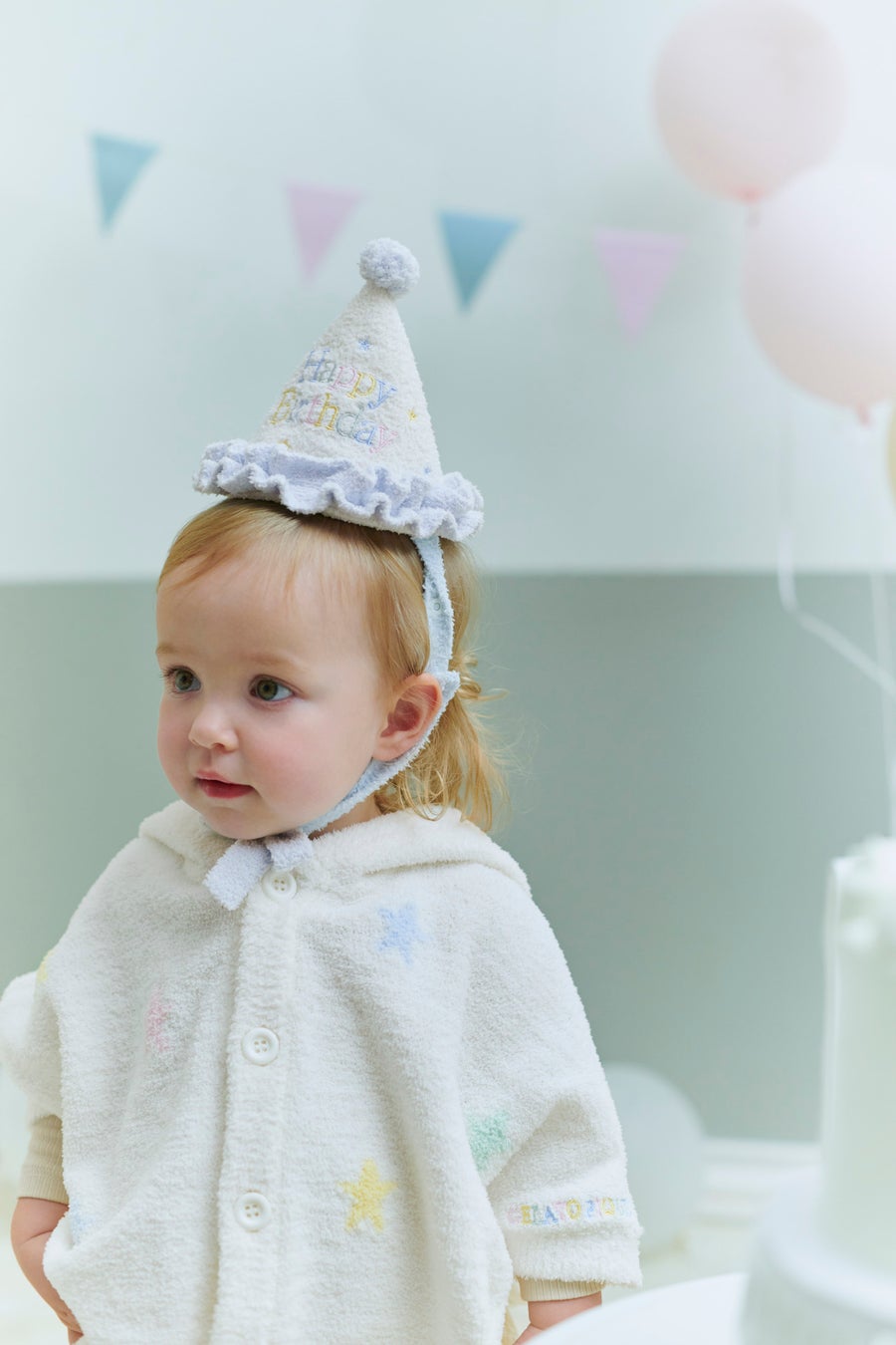 “Happy Birthday”と星の刺繍がきらめくバースデーハット。