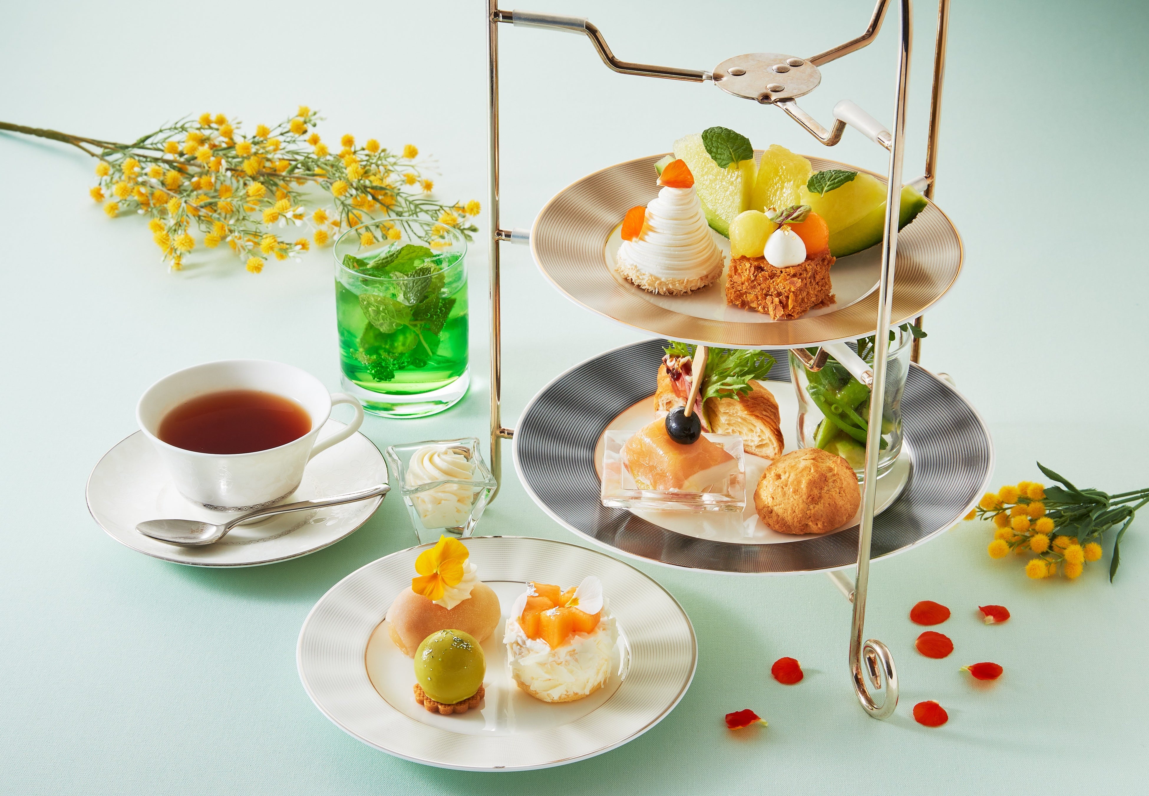 アフタヌーンティーセットは、「メロンのショートケーキ」や「メロン大福」、「生ハムメロン」など、メロンの甘みとみずみずしさを活かしたスイーツとセイヴォリーが並びます。ドリンクは、オリジナルドリンク「メロンソーダ ミント風味」をはじめに提供するほか、紅茶ファンに人気の高いドイツの老舗紅茶ブランド「ロンネフェルト」の紅茶・緑茶、全10種がお楽しみいただけるティーブッフェをご用意します。
