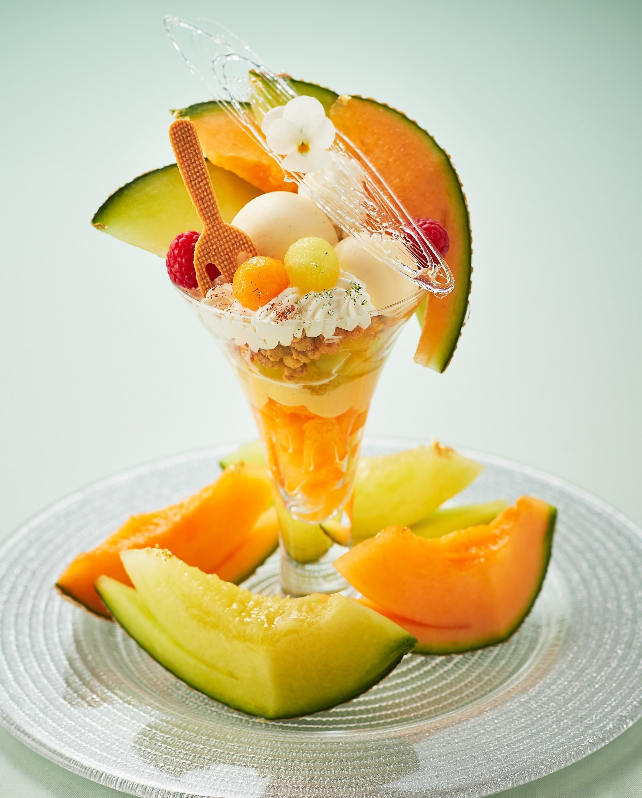 パフェは、赤肉と青肉を合わせて半玉分使用し、贅沢に仕上げました。グラスの中にはフレッシュメロンやカスタード、スポンジ、バニラアイス、レアチーズアイスなどをバランス良く重ね、その周りにフレッシュメロンをたっぷり飾ったメロン好きの方必見の一品です。
