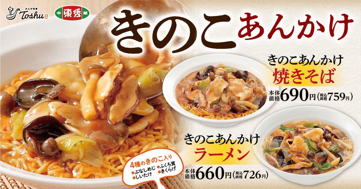 中華料理店「れんげ食堂Toshu」「中華東秀」を展開しているイオングループのオリジン東秀株式会社(本社:東京都調布市/代表:沢村 弘也)は、9月7日(水)より、「きのこあんかけ焼きそば」と「きのこあんかけラーメン」を期間限定で販売いたします。