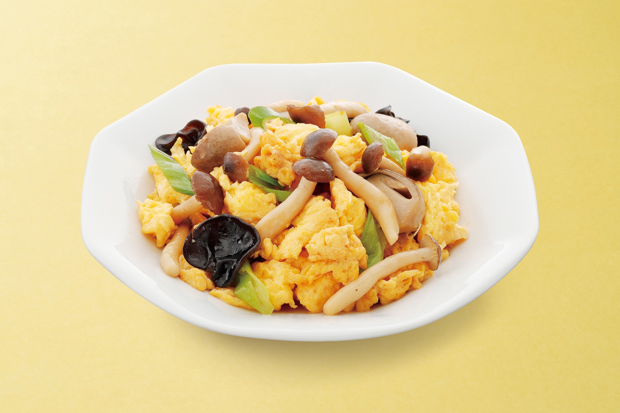 熱々のきのこあんは、醤油ベースのオイスタータレで仕上げました。きのこの食感を楽しみながら、ゆっくりお召し上がりください。ぶなしめじ、ふくろ茸、きくらげの3種のきのこを使用した「玉子ときのこ炒め」もご用意しております。
