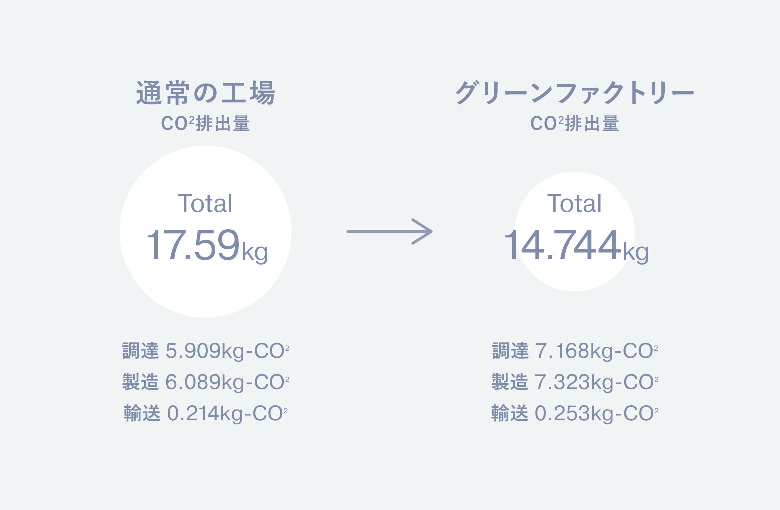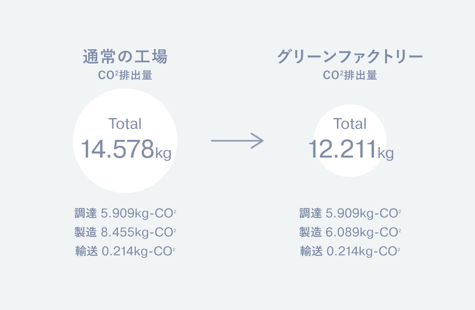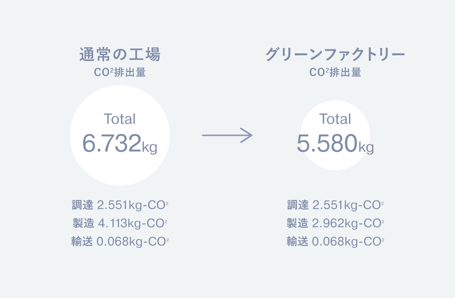 第3弾となる今回のemmi x PlaX™の製品に関するLCA分析では、製造過程で排出されるCO2の量に着目した比較を実施。通常の工場で製造したものと、必要電力の45%をソーラー自家発電でまかなっている"グリーンファクトリー"で製造したものでは、CO2排出量を1製品あたり15〜17%削減できることが明らかになりました。